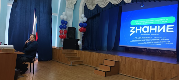 Лекционное занятие было посвящено Нюрбергскому процессу, лектор коснулся Хабаровского процесса, который состоялся с 25 по 30 декабря 1949 г. в нашем городе над японскими фашистами. Чадаев Е.Н. является членом общества «Знание», общество проводит открытые уроки, различные просветительские мероприятия по историческому, политическому, патриотическому направлению во многих образовательных организациях города.