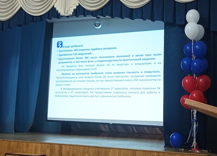 В железнодорожном техникуме состоялась историческая лекция кандидата исторических наук, профессора Е.Н.Чадаева «Суд народов, приговор фашизму на Нюрнбергском процессе». Нюрнбергский процесс начался с 20 ноября 1945 года, основной процесс завершился 1 октября 1946 года.