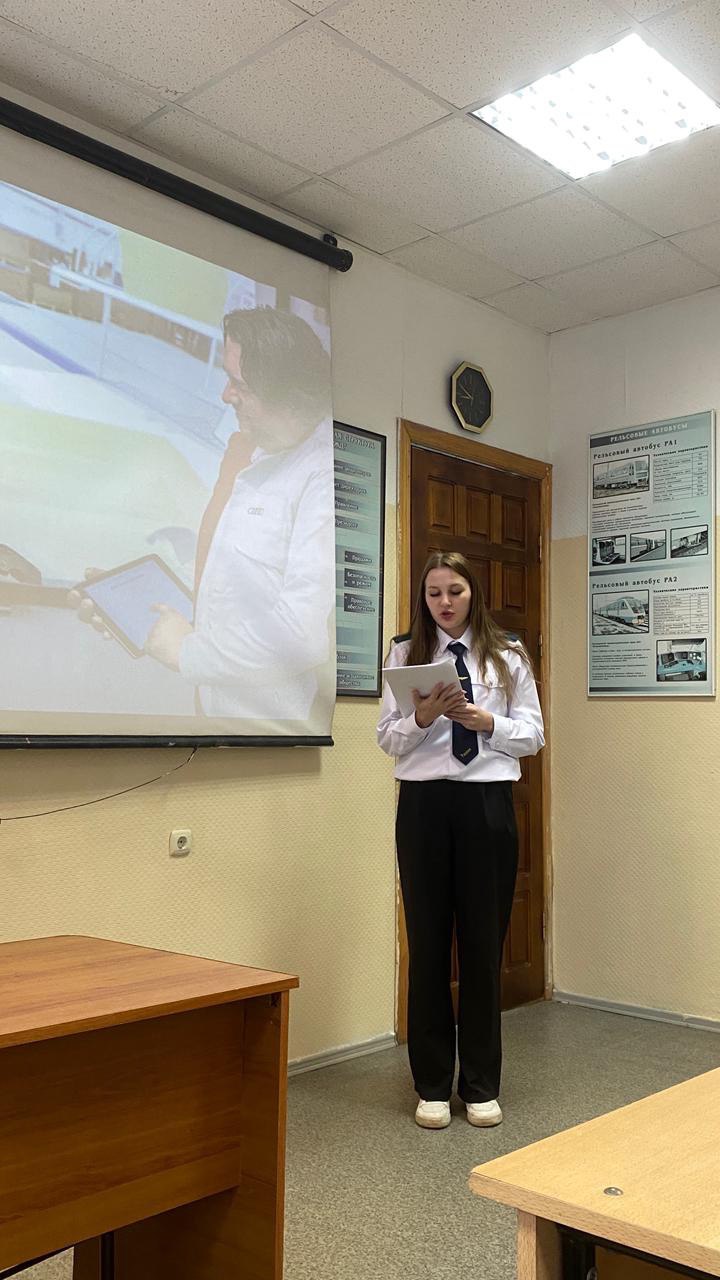 28 ноября для групп ПОТ21ОПУ, ПОТ22ОПУ, ПОТ31ОПУ, ДОТ31ОПУ, председателем ПЦК Надменко Н.Г. была организована научно-практическая конференция «Технологии инновационного развития», посвященная современным решениям на железнодорожном транспорте как одному из наиболее перспективных направлений его развития. Основная цель конференции: познакомить аудиторию с инновационными технологиями в цифровизации железнодорожной отрасли. В конференции приняли участие около 25 человек. С докладами выступили обучающиеся 1-4 курсов: Худышкина Т.С., Хегай А.А., Широков Е.В., Поливина Е.Г., Костина А.Н., Шардакова А.А., Гавришкив А.А. Научными руководителями были преподаватели: Надменко Н.Г., Страпачук Н.В., Чумакова Т.И., Стефанович М.В, Суворина Е.В., Зеленина Н.В. Доклады были содержательные, увлекательные и интересные. Обучающиеся совместно с научным руководителем, разработали свои презентации для тем докладов. Зрители конференции также проявили активность и задали все интересующие их вопросы.